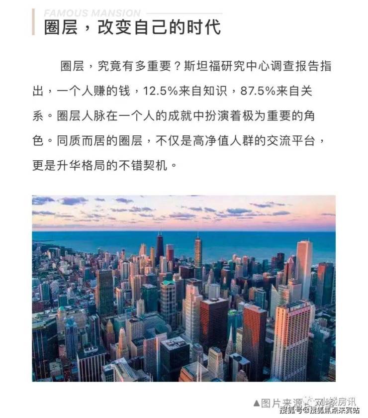 随着时代不断向前,人们更向往一个汇聚各种资源的“超级生活主场”。胡润富豪榜创始人胡润先生表明:“十年前,富豪们买楼时,更多的是关注地段和开发商的品牌,而如今,地段所占的因素明显弱化,圈层所占的因素明显强化了。”由层峰资源和名流圈层构建成的人脉网络,更加弥足珍贵。