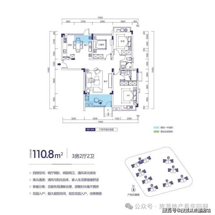 户型1:建筑面积约110.8㎡,3房2厅2卫。该户型方正,南北通透;客餐分离,功能布局清晰合理;南向主卧,带独立卫浴,飘窗设计;超大庭院空间,前后花园入户,居住体验感大大提高。