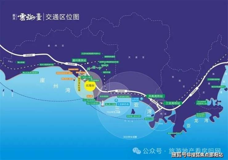 航天·云海台位于三亚崖州湾深海科技城中央大道与创业路交汇处,距离环岛高速互通不到3公里,距离环岛高铁崖州站约5公里,距离三亚凤凰机场约30公里,距三亚市中心约35公里。项目1公里范围内有13个公交站点,5/6/11/30路等公交线路经过,交通便利。