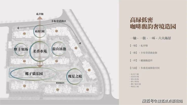 •高绿低密 咖啡馥韵奢境造园一轴:礼序轴,打造拾级而上、造型水景、礼仪大堂、下沉花园的归家礼序一街:卡布奇诺商业街,咖啡BAR、街角卡座,开启小资度假商业模式一环:约380m健康跑道环,趣享健康生活六大场景:礼仪门庭、柔香水苑、蓝山泳池、摩卡聚场、椰子猫乐园、瑰夏之庭
