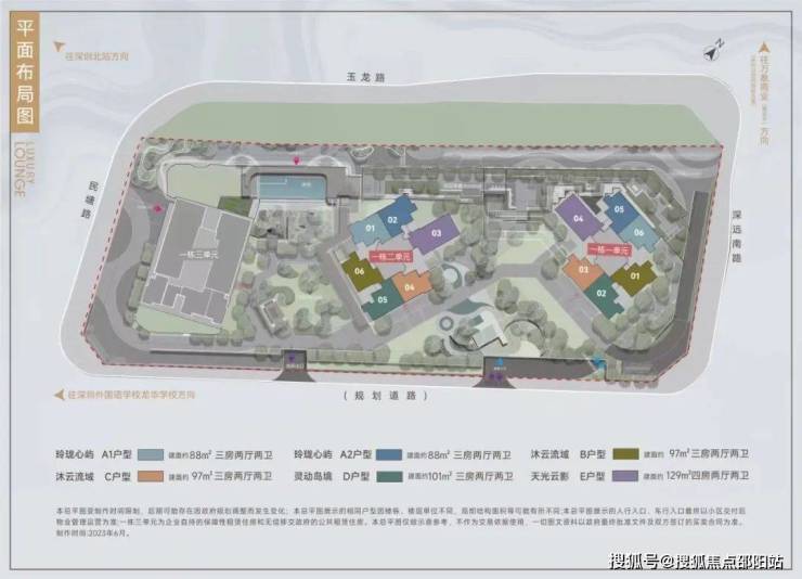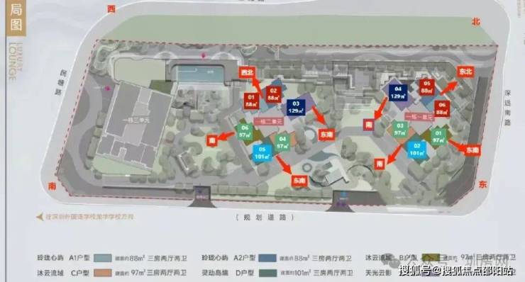 朝向方面,除了小面积的88㎡,97㎡及以上户型不是朝东就是朝南。