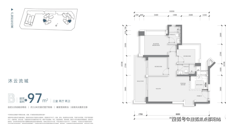 +【97㎡3房2厅2卫】:对比88㎡户型,就是空间更大了,居住的舒适度会更大。客厅开间3.8米,另外还有一个6.5米长的双阳台。
