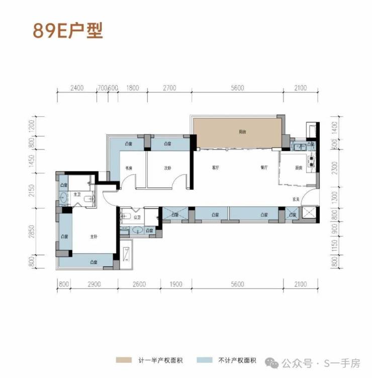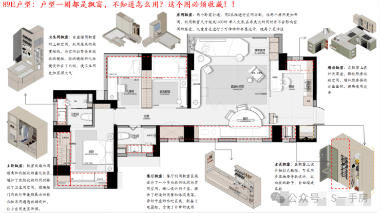 相比89E户型,飘窗设计相对较少,整体赠送空间与市场主流产品接近,实用率约95%。户型规划方正,动静分区合理,采用四开间朝南设计,采光和居住舒适度较好,算是中规中矩的产品。