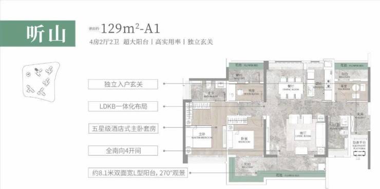 建面约129㎡听山户型,阳光玄关设计,兼容了户内的私密性,储物空间又是全明采光,也符合广东地区对风水的理解,舒适性和实用性都考虑到。