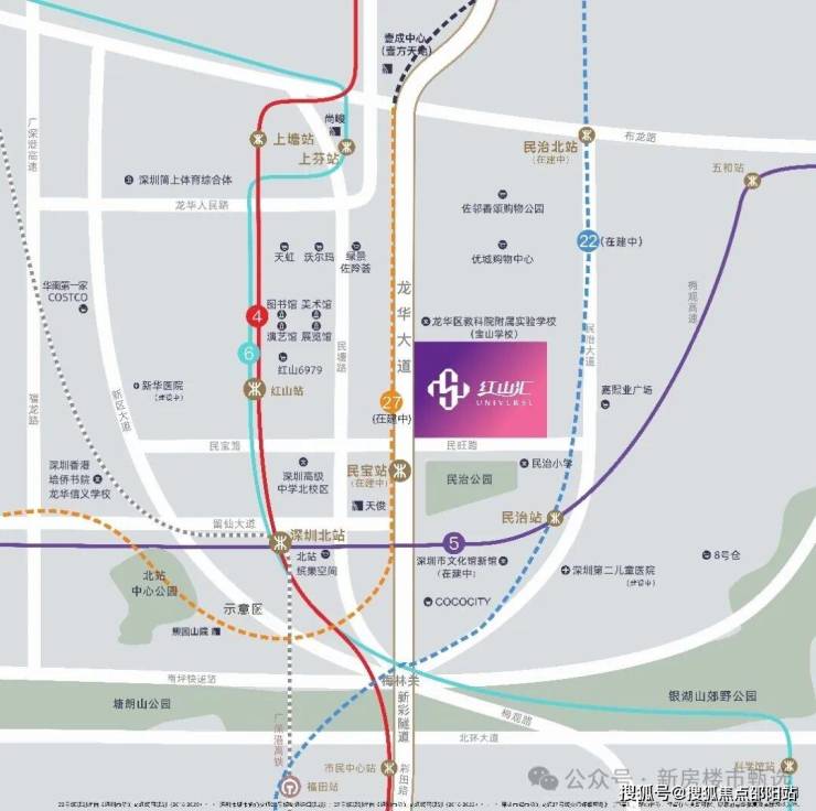 “1高铁、4地铁(含在建)、4站点”环绕,距离在建地铁27号线民宝站直线距离约200m,距离地铁5号线民治站900m,地铁4/6号线红山站1km内,其中深圳最繁忙地铁5号线享约112万人次/日客流,更有全国最大高铁枢纽—深圳北站加持,约7000万人次年吞吐量,汇聚八方客流。