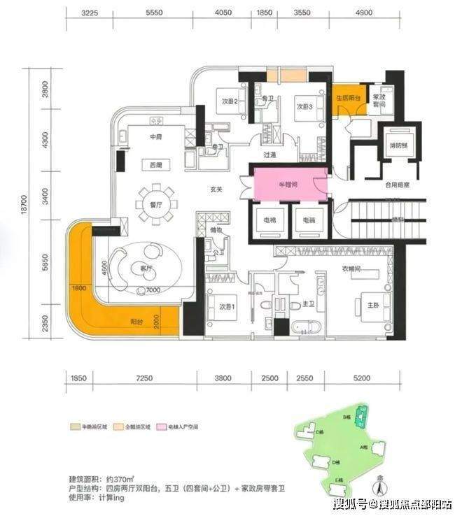 分布于D座和E座,3梯2户设计,专梯入户保障私密性。户型采用弓形结构,家政套间与采光面设计为亮点,270°环幕景观阳台可最大化享受海景视野(20层以上视野更佳)。作为项目首推户型,该户型性价比突出,总价约5000万内,在同价位段具备较强的市场竞争力,适合追求空间舒适度与景观体验的高净值家庭。