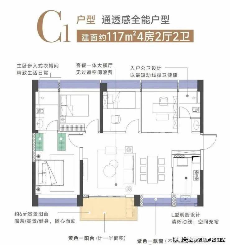 建面约117㎡横厅4房2厅2卫,与116㎡同个面积在横厅设计,自然是可以满足南北通透的需求。