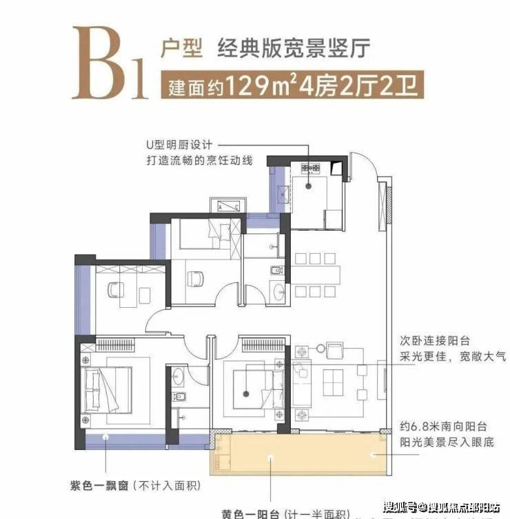 建面约129㎡竖厅4房2厅2卫,尺度进一步放大,一体化餐客厅让空间观感更通透,从约6.8米宽景阳台向外望去,可无遮挡看园林景观。阳台直通一间卧室,美景就在床边。主卧配置一个大飘窗,将采光和景观面放大。