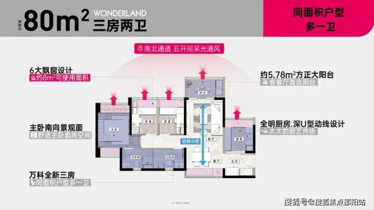 建面约80㎡三房两厅两卫,同面积户型多一卫