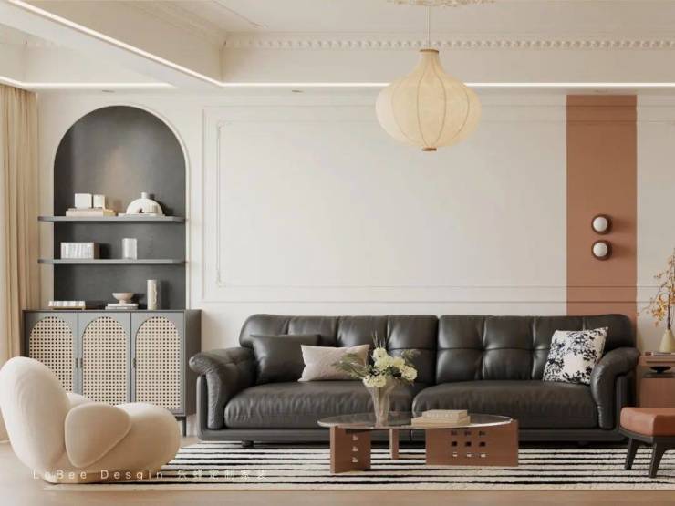沙发背景墙则以极简的IP线条勾勒竖纹,搭配黑色焦糖色成品沙发与抽象晕染地毯,克制中透出复古优雅。空间多处运用拱门石膏线条强化立体层次。