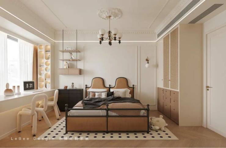 墙面做立体石膏线条加法式角花配合做造型,温馨浪漫的氛围感满满~
