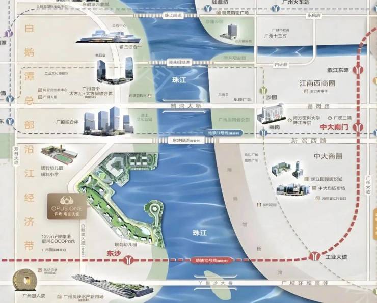 交通配套方面,项目周边的交通网络在逐步完善。临近白鹅潭大道,自驾出行较为方便;外通东沙石岗隧道,可快速连接海珠西。
