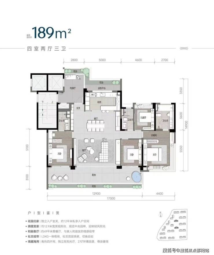 189 平米奢华四房,约 12.9 米宽景观阳台、LDKG 一体格局且社交双厨系统,空间奢阔。