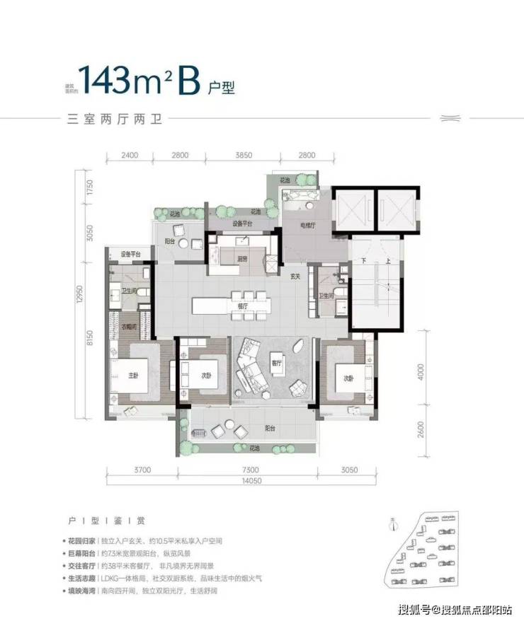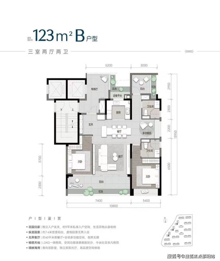 如 123 平米舒适三房,有独立入户玄关、约 7.4 米宽景阳台、LDKG 一体格局等亮点;