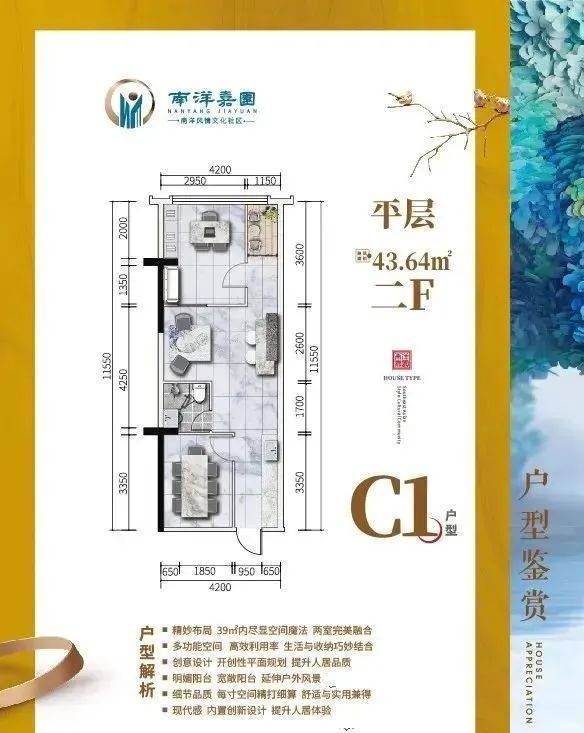 ·C1户型:平层,约43平方米,两室两厅一卫,小而美的典范,每一寸空间都充满了智慧与巧思。
