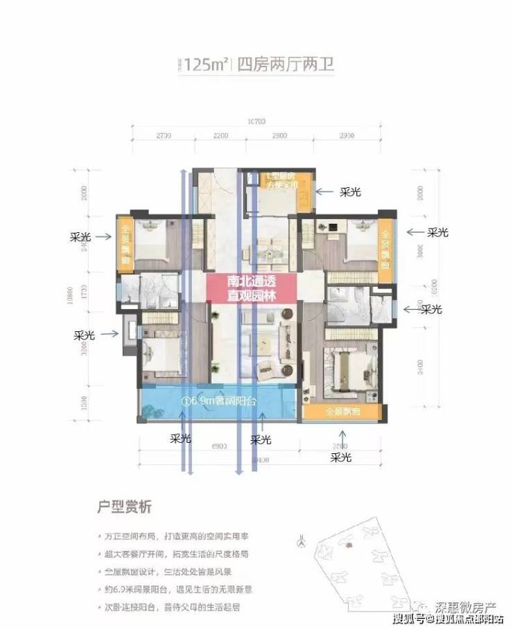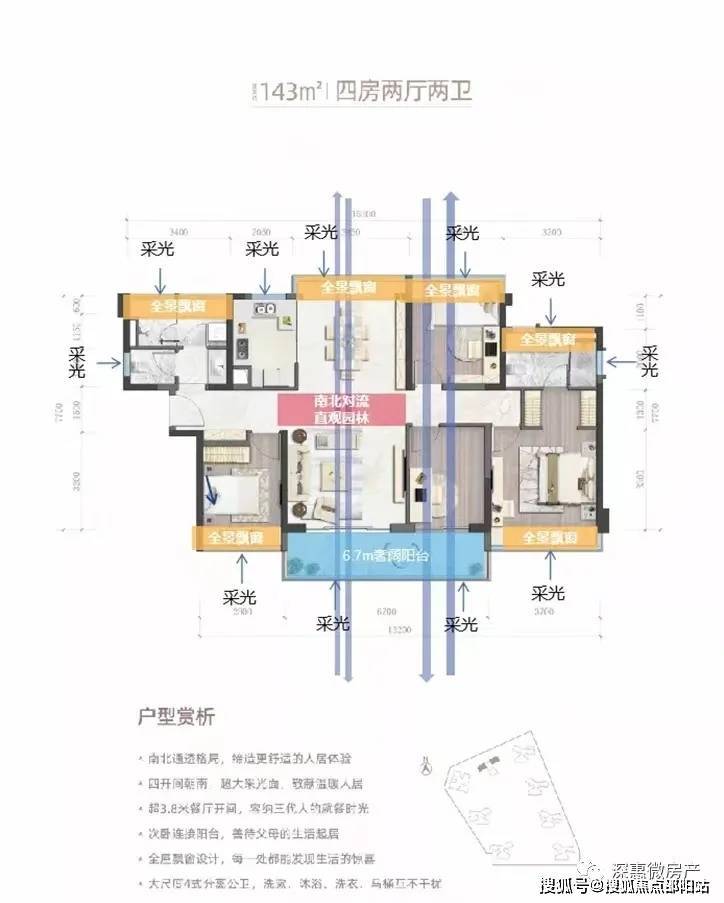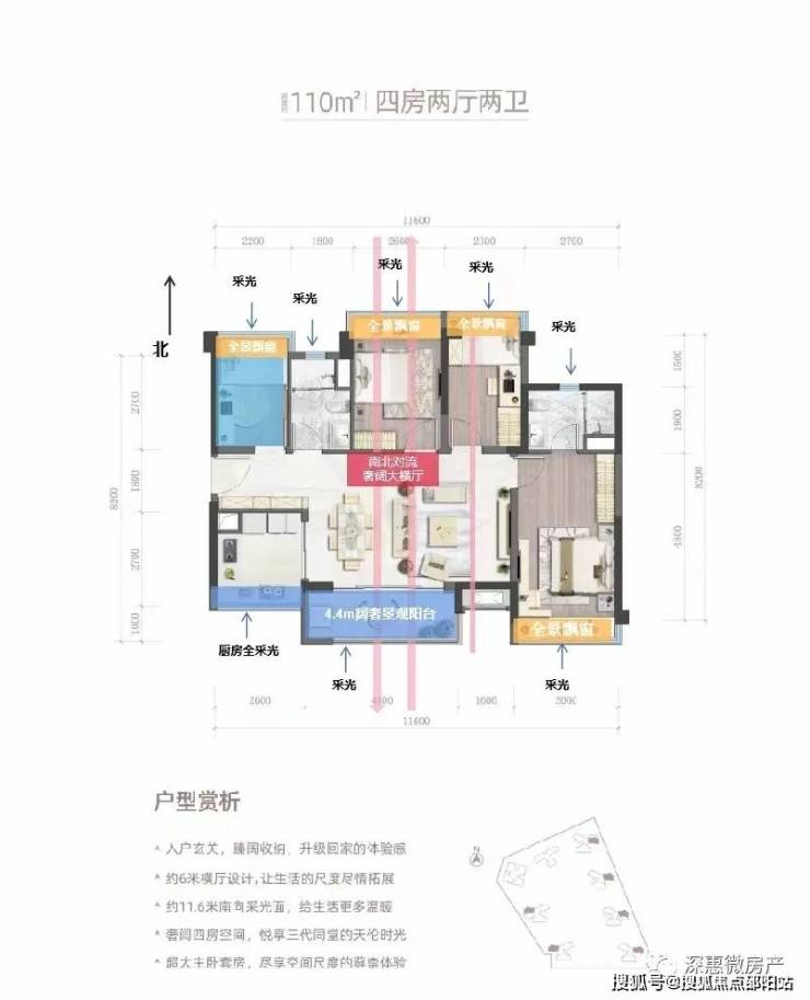 超实用4房,采用超大横厅设计,南北通透,约4.4米景观大阳台,三代同堂没压力。