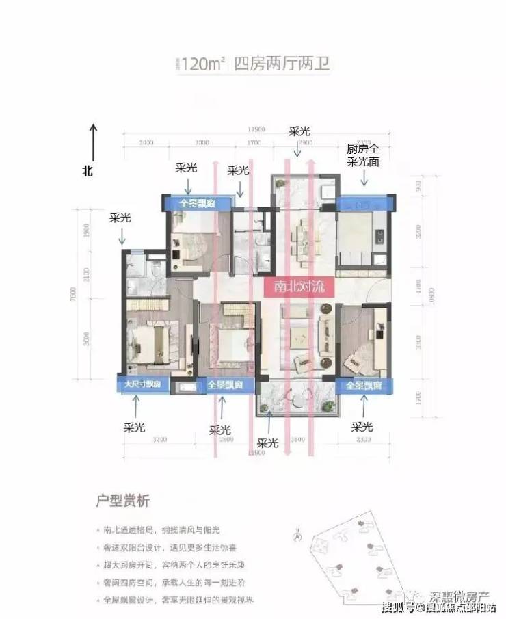 可做到全功能四房空间,南北对流,采光通风优秀,采用双阳台设计,全采光厨房,三卧室看整个花园景观,安静舒适。