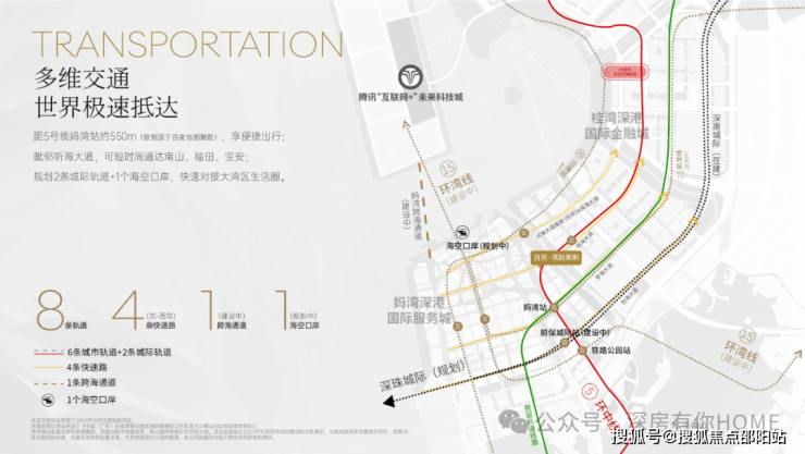 距离5号线妈湾站步行约550米,此外将还有15、21、27、穗莞深城际等多条轨道交通串联前海与其他重点片区。周边还有兴海大道,听海大道,月亮湾大道等主要交通要道,去往科技园、福田十分便捷。