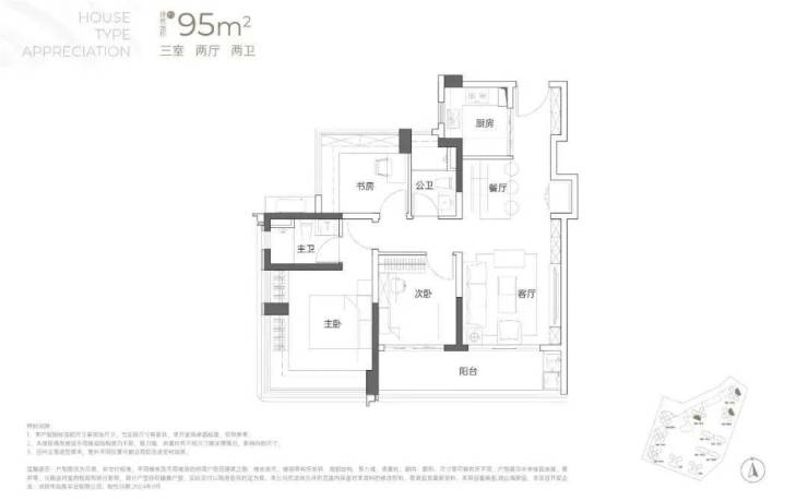 95㎡的3房2厅2卫设计的是竖厅格局,客厅3.5米开间,LDKB一体化,S墙设计预留冰箱卡槽位,3个卧室分别做到了3.6米/2.8米/2.8米的宽度,主卧加1个次卧270°全景飘窗,客厅连接次卧出6.3米长的大阳台,U型厨房,得房率约85-95%(包含赠送),西南或东北朝向。