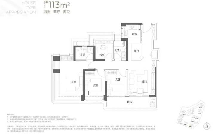 113㎡的4房2厅2卫设计的是横厅南北通透格局,客餐厅6米开间,LDKB一体化,全屋飘窗,4个卧室分别做到了3.9米/3米/2.8米/2.6米的宽度,主卧加1个次卧270°全景飘窗,客厅出6米长的大阳台,L型厨房,得房率约85-95%(包含赠送),西南或东南朝向。