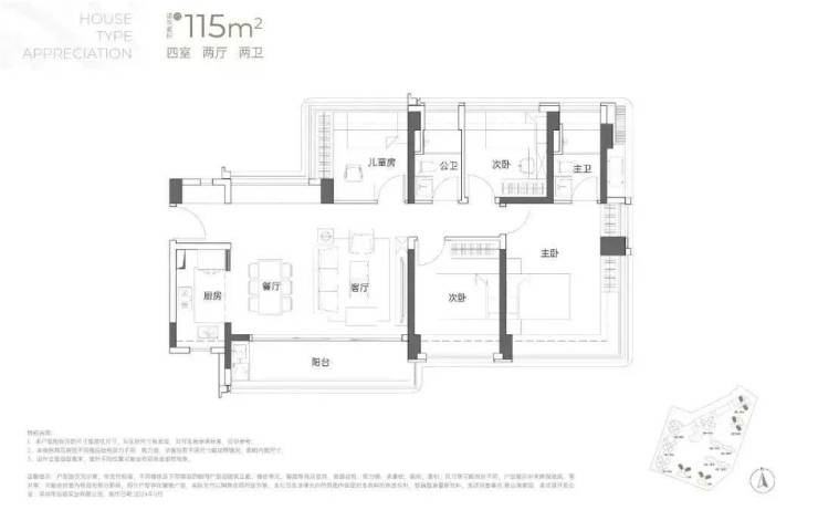 115㎡的4房2厅2卫设计的是横厅南北通透格局,客餐厅6米开间,LDKB一体化,全屋飘窗,4个卧室分别做到了3.9米/3米/2.8米/2.6米的宽度,主卧加1个次卧270°全景飘窗,客厅出6米长的大阳台,L型厨房,得房率约85-95%(包含赠送),西南或东南朝向。