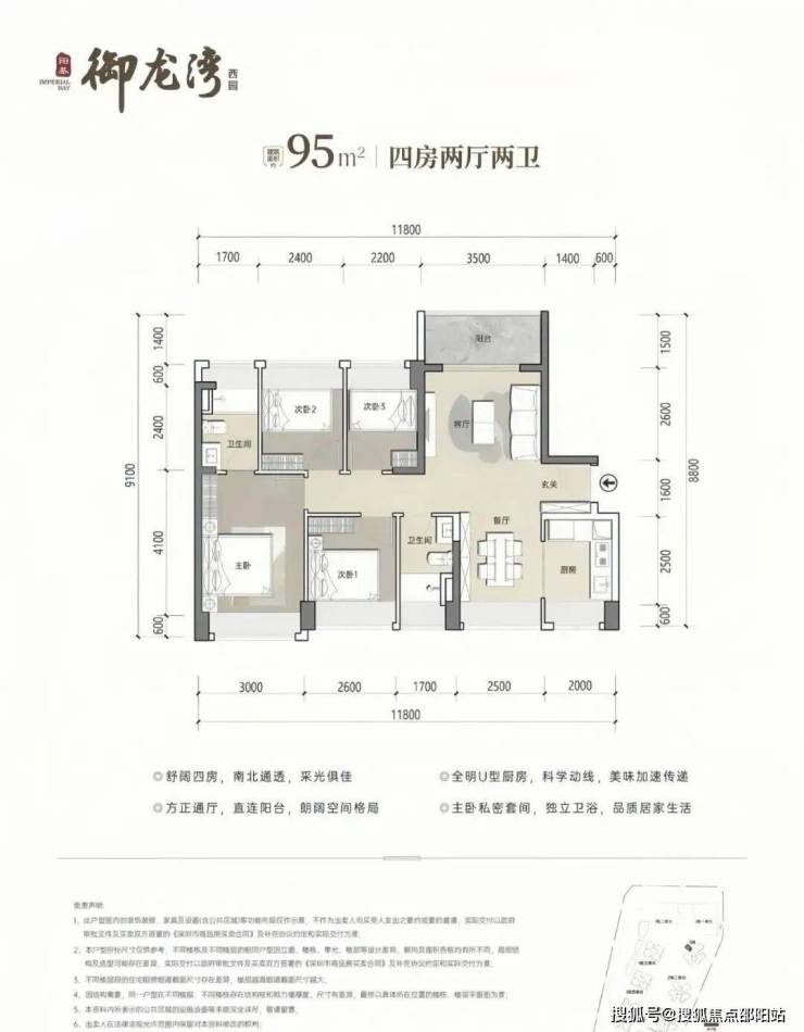 95㎡4房2卫,分布在2栋1单元06户型,设计的是竖厅南北通透格局,客厅开间3.5米,五开间朝南,U型厨房,公卫三段式分离设计,得房率约79.25%(不含赠送),阳台主朝东北向,加上赠送得房率约93%