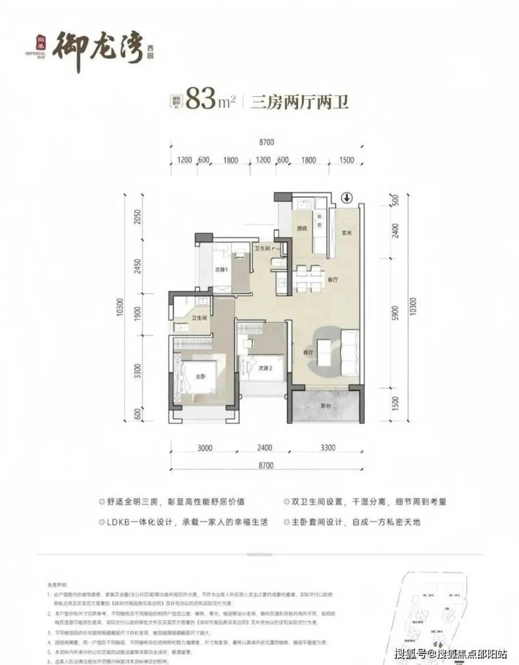83㎡3房2卫,分布在2栋2单元03/04户型,设计的是竖厅格局,客厅开间3.3米,LDKB一体化设计,三开间朝南,U型厨房,公卫三段式分离设计,得房率约79.25%(不含赠送),东南或西南朝向,加上赠送得房率约89%
