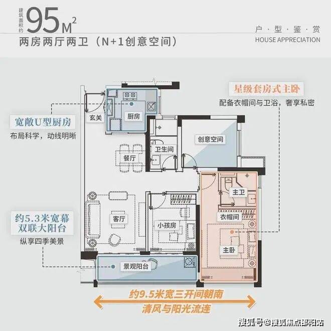 约95方,打造出约5.3米宽幕大阳台,约9.5米三开间朝南观景面。
