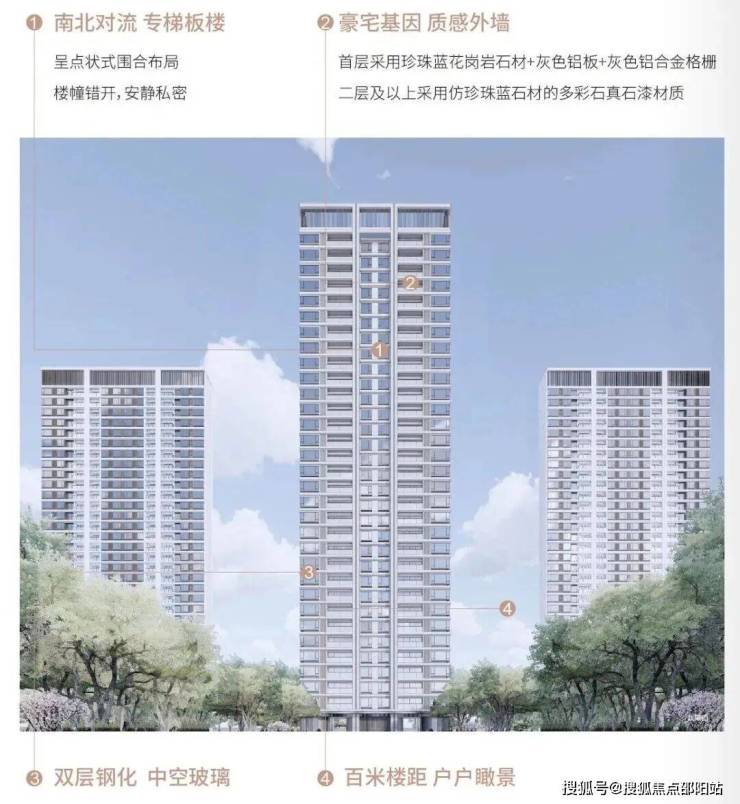 项目采用以深灰与浅灰为建筑主色调的现代简约建筑设计风格,注重居室空间的布局与使用功能的完美结合。外立面采用珍珠蓝仿石漆、水晶灰玻璃、深灰色涂料与深灰色金属百叶的搭配使用,保证建筑的耐久性、稳定性及自洁性,于严苛选材中凝练时光优雅。私密围合布局,一核,一轴,四组团,多节点,户型方正尺度舒适,全景观阳台,户内景观资源视野最大化,地上地下双归家礼仪备享尊崇,打造西区品质标杆。