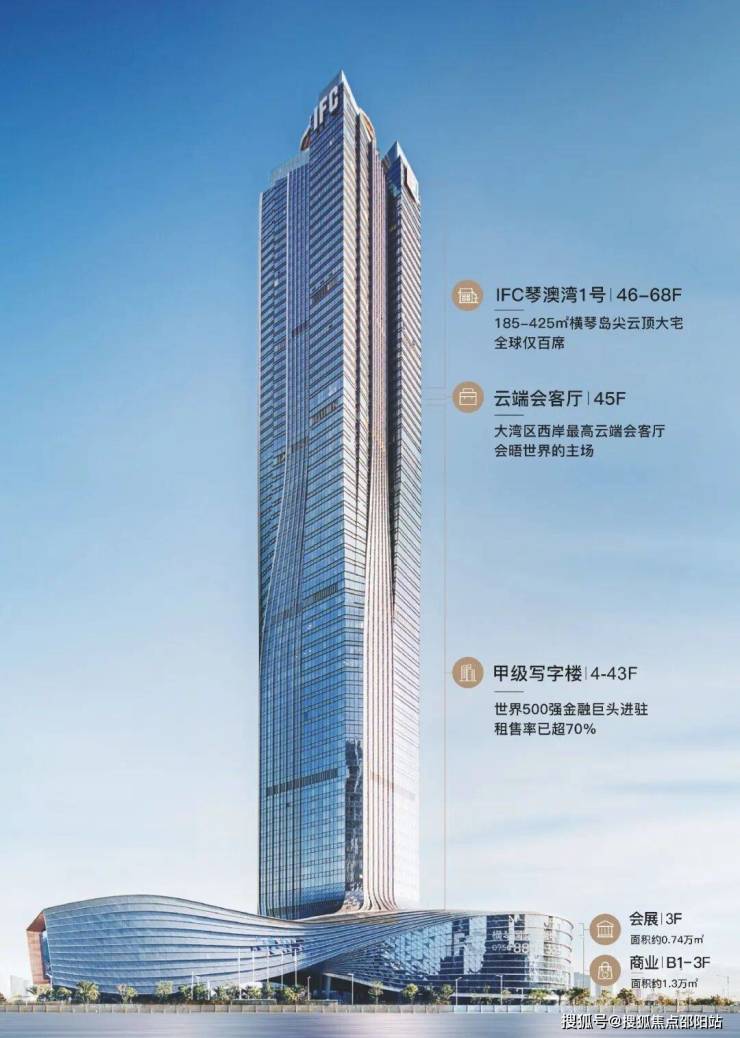 以339米澳琴第一高楼IFC横琴国际金融中心领衔,联袂IFC2期(华通金融租赁总部大厦)、IFC3期(横琴国际交易广场),缔造约45万方鎏金海岸线天际综合体集群。