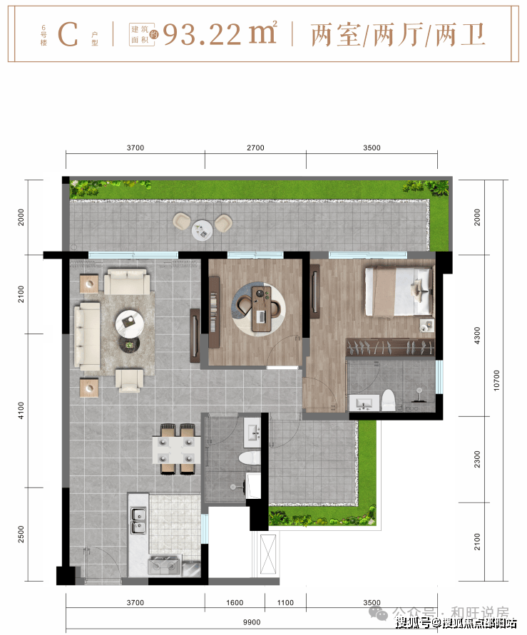 6#楼C户型约93㎡舒阔两房两厅两卫