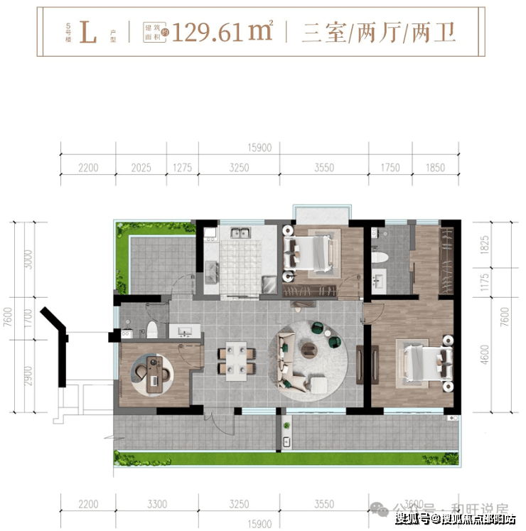 5#楼L户型约129㎡三房两厅两卫