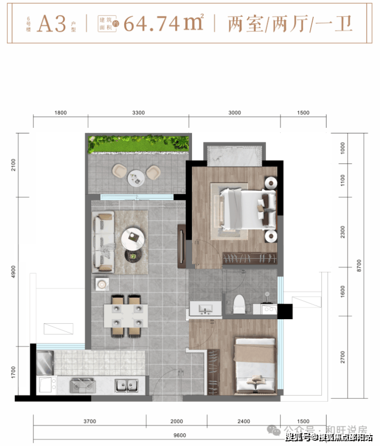 6#楼A3户型约64㎡精致两房两厅一卫