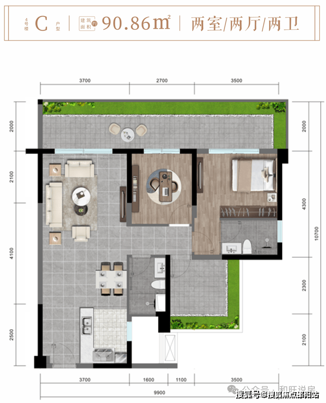4#楼C户型约90 .86㎡两房两厅两卫