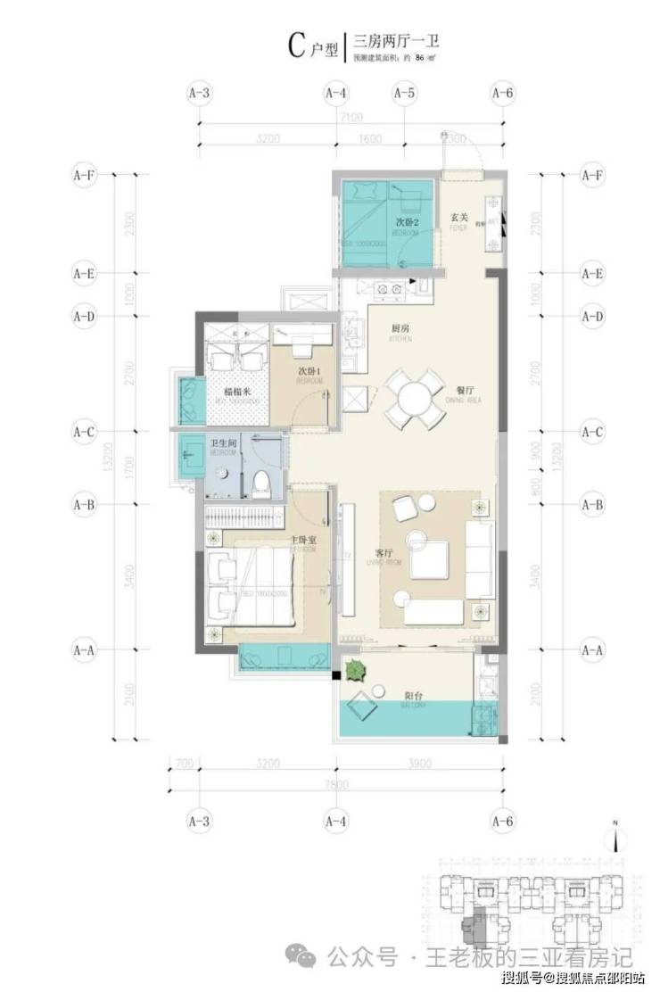C户型建筑面积:86㎡赠送面积:12.44㎡户型设计:三房两厅一卫