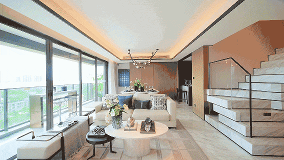 走进社区,最先注意到的是那70层级退台设计。由于地块本身有3-6米高差,建筑师陆皓团队顺势而为,让每户都能拥有无遮挡的瞰山视野。外立面用多玻璃幕墙搭配天然花岗岩、真石漆与铝板,线条简洁却富有层次,远远看去,建筑像是从山体里自然生长出来的,而不是硬生生“盖”上去的。