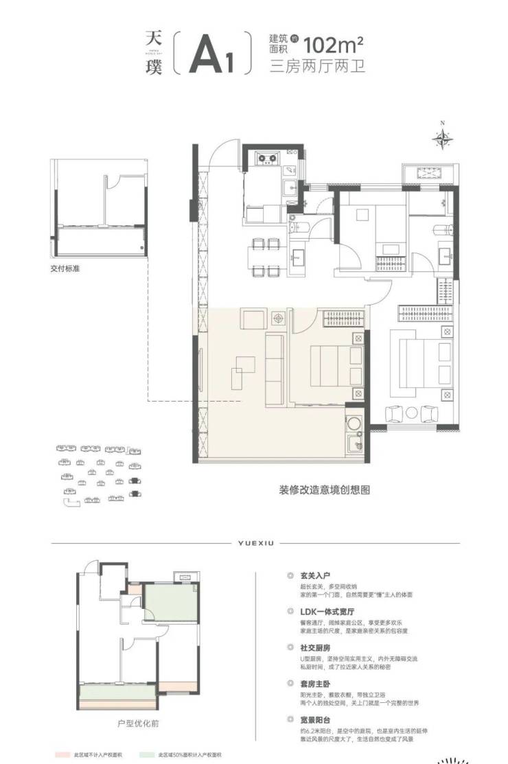 102㎡,三室两厅,双卫设计,赠送18.5平,约合得房率91%,