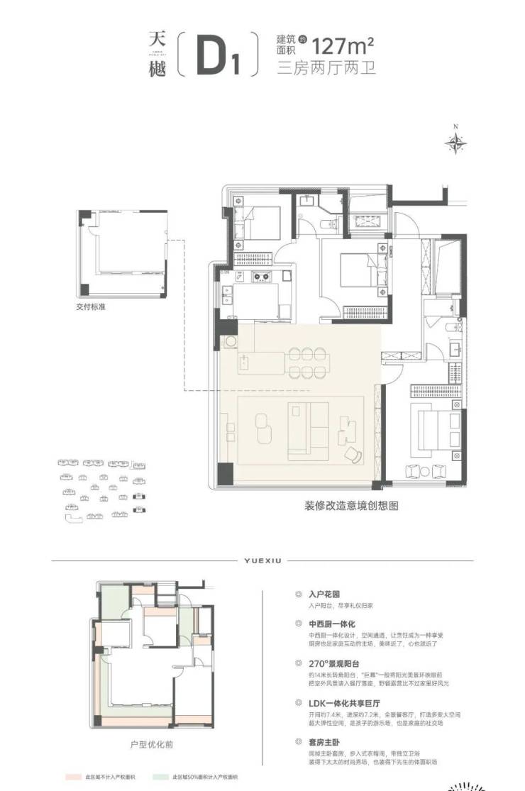 127㎡,独立入户玄关,270°环慕落地窗,三面采光,赠送33平,约合得房率99%,