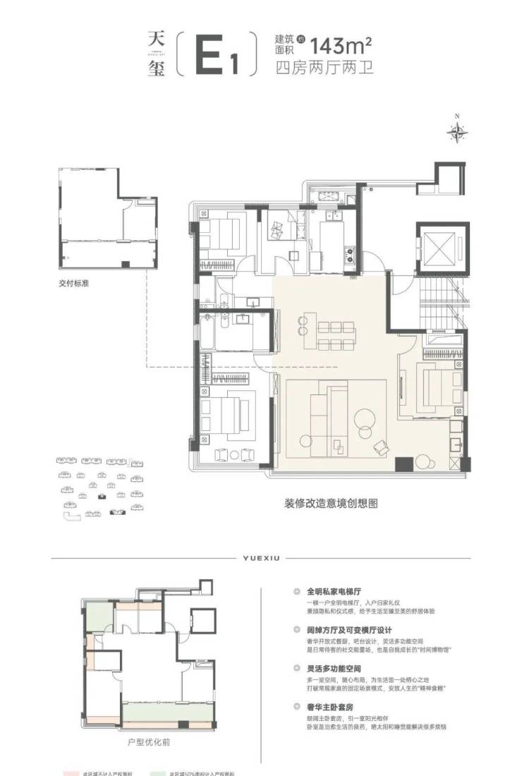 143㎡,四室两厅,一梯一户,独立私家电梯厅,赠送37平,约合得房率100%,