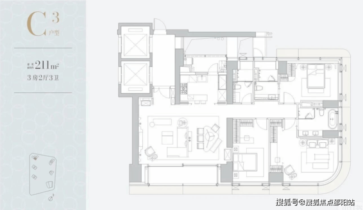 211-218㎡3房户型图:分布在C栋(51F),层高3.3米,4T3。