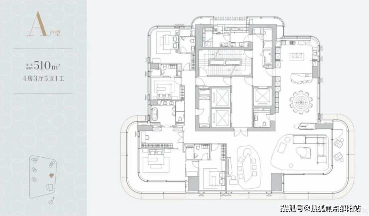 510㎡4房5卫:位于A栋(43F),层高3.6米,3T1,目前深圳还没有这个面积段的二手大平层住宅,直接对标澐玺的500㎡。