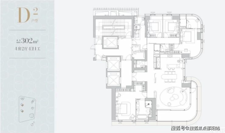 302㎡4房4卫:位于D栋(45F)和E栋(43F),其中E栋属于一线海景位,D栋是二线海景位。都是3T2,层高3.5m,且都有双门梯,专梯入户。