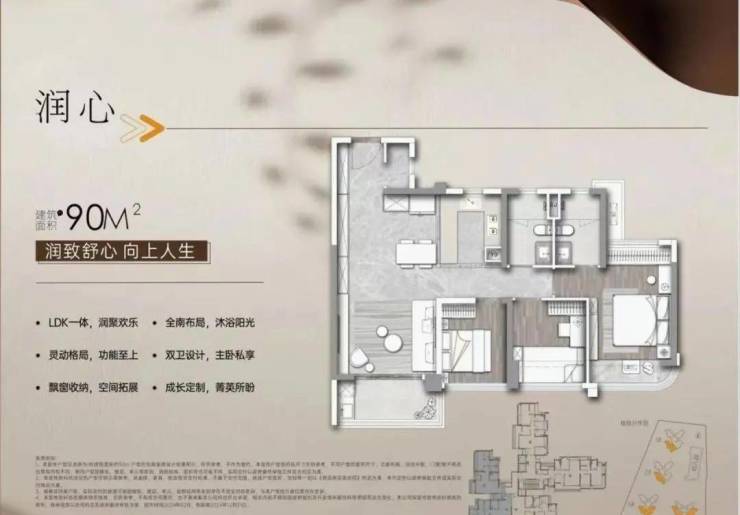 建面90平三房两卫,全屋南北通透,四开间朝南,3个卧室朝南,LDK一体化,可打通次卧做到大客厅