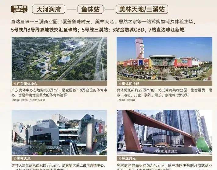 线路二,联通5号线、13号线地铁站和购物中心,可以直达珠江新城和国际金融城两大CBD。