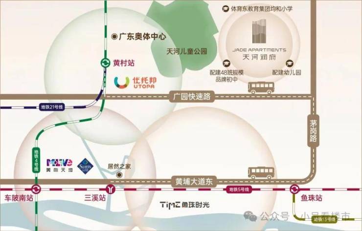 项目位于广园路旁,天河跟黄埔的交界处,背靠天河智慧城和金融城,距离琶洲商圈仅有10公里,闲时开车去往金融城、琶洲、珠江新城等地20分钟左右就能到,虽然上下班高峰期广园路会有拥堵情况,但是3-40分钟左右都能到,自驾的话是没问题的,附近暂时没有地铁。