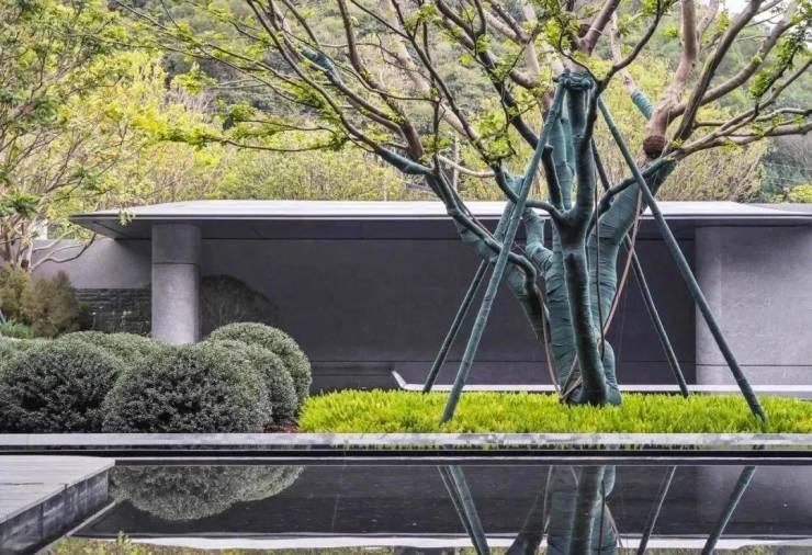润府园林,有种穿梭在岭南山水之间的感觉,树种和落客区相呼应,听说以后都会移植到小区内部,水景地面的黑金沙石材,让水面显得格外清澈,能清楚看见倒映的树、山和天空。
