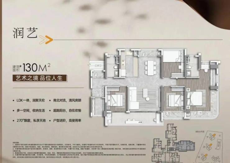 建面130平四房两卫,入户即见对景式玄关,可做景观装饰,也可做玄关柜收纳,该户型LDKB一体化设计,客厅开间超4米,可打通客厅旁的次卧做成7.2米大方厅,主卧配270度全景舱,可双面屏观景