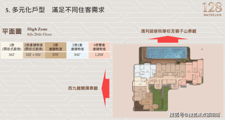 128 Waterloo的D、F、G&H室皆可北望玛利诺修院学校和狮子山景观,因为从128 Waterloo向北一直到九龙塘都是以学校居多,因此景观非常开扬,而C&B户型可以西望西九龙楼景。