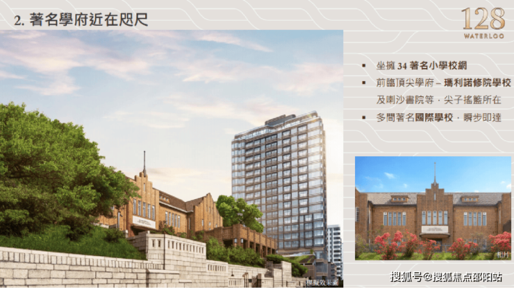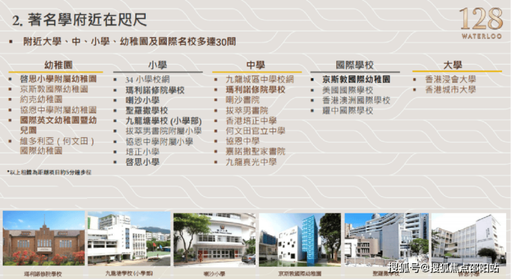 128 WATERLOO建立在名校聚集地之上,名校林立,项目坐落于34名校网,包括有协恩中学附属小学、陈瑞祺(喇沙)小学、马头涌官立小学等。项目亦临近百年学府玛利诺修院学校,香港培正中学等学校,名校近在咫尺,附近也有不少国际学校。