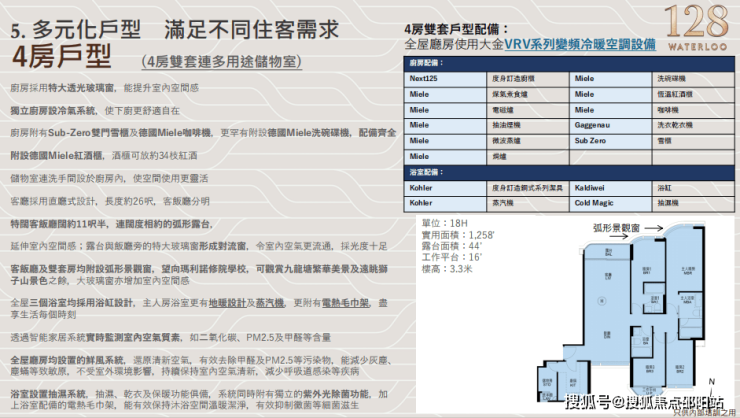 H室是4房户型,实用面积1,258尺,共计15个单位。